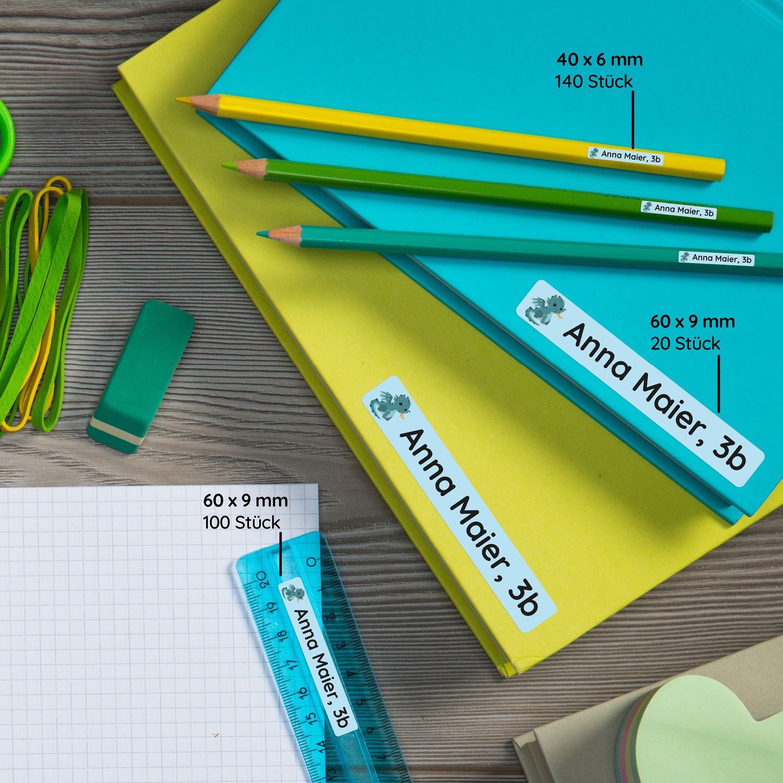 Name labels for children are individually designed stickers that bear the child's name and serve to mark the child's items and utensils. They are available in various sizes, shapes and colors and can be applied to lunch boxes, drinking bottles, school books, sports bags and other personal items.