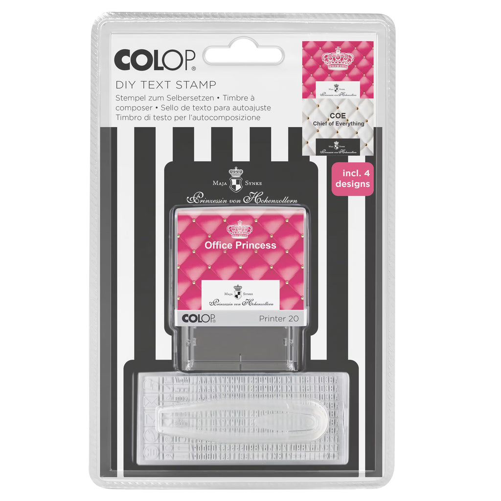 The modern Colop Printer 20 meets playful design: two interchangeable image cards in pink and white provide the perfect look – depending on your mood or outfit. Thanks to the included type set and tweezers you can quickly and individually design your personal text.