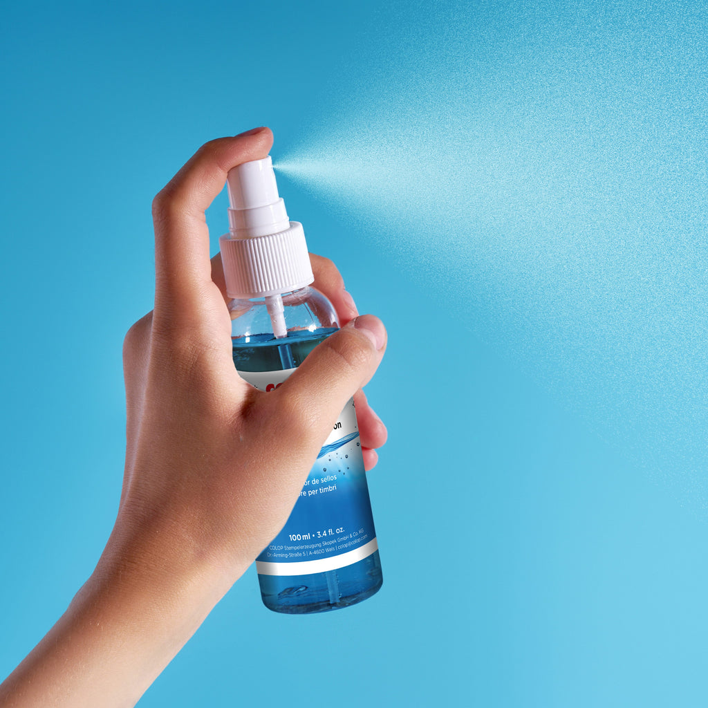 1️⃣ Clean the stamp: Place the stamp on a paper towel and spray the cleaner directly onto the printing plate.