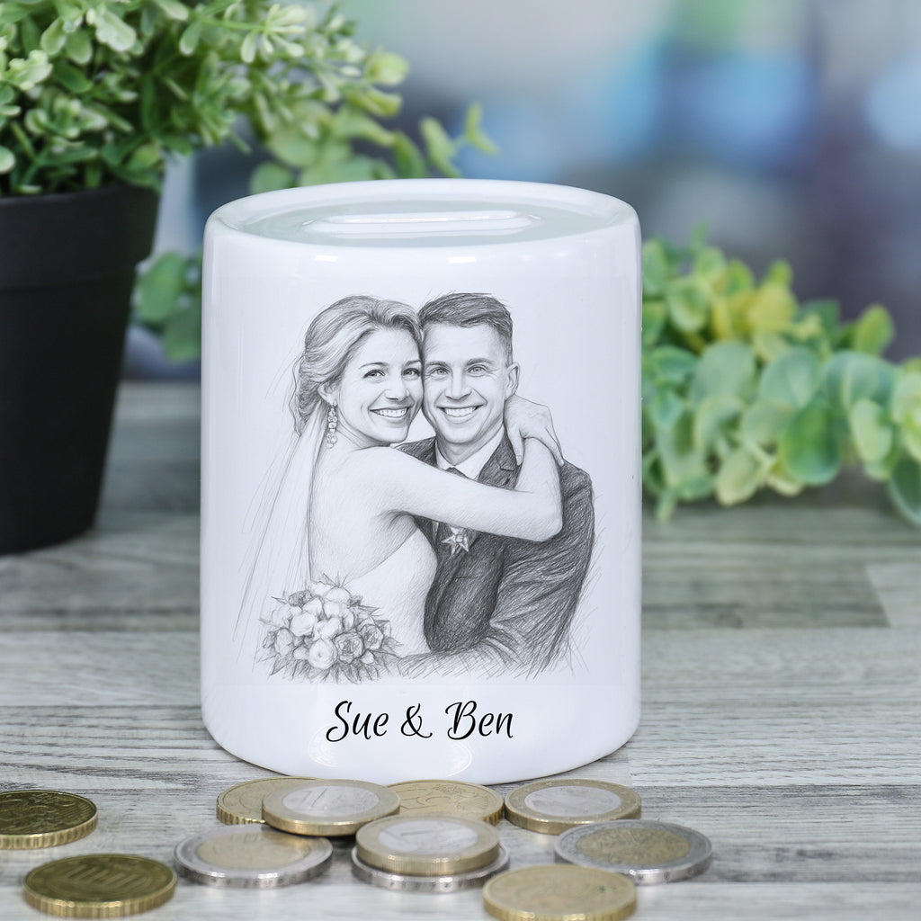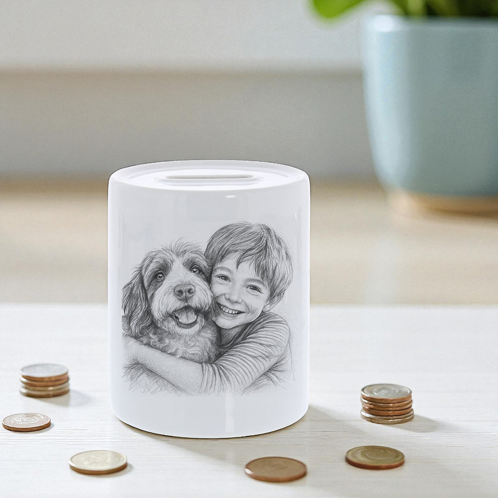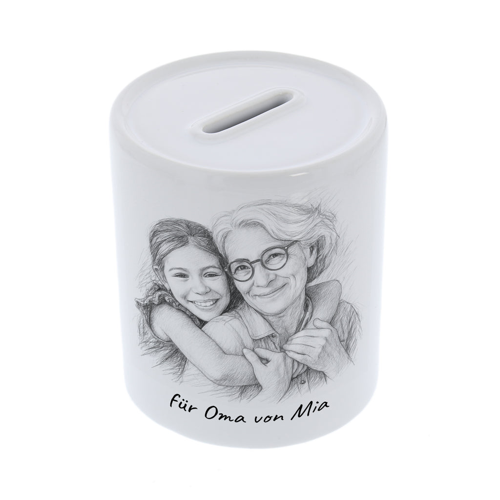 With this personalized ceramic piggy bank 🏺 saving becomes really fun! Simply upload your photo 📸 – we transform it into a unique caricature ✏️ for you, which is printed on the piggy bank together with your custom text 💬. This creates a funny, personal one-of-a-kind piece that's guaranteed to brighten your day!