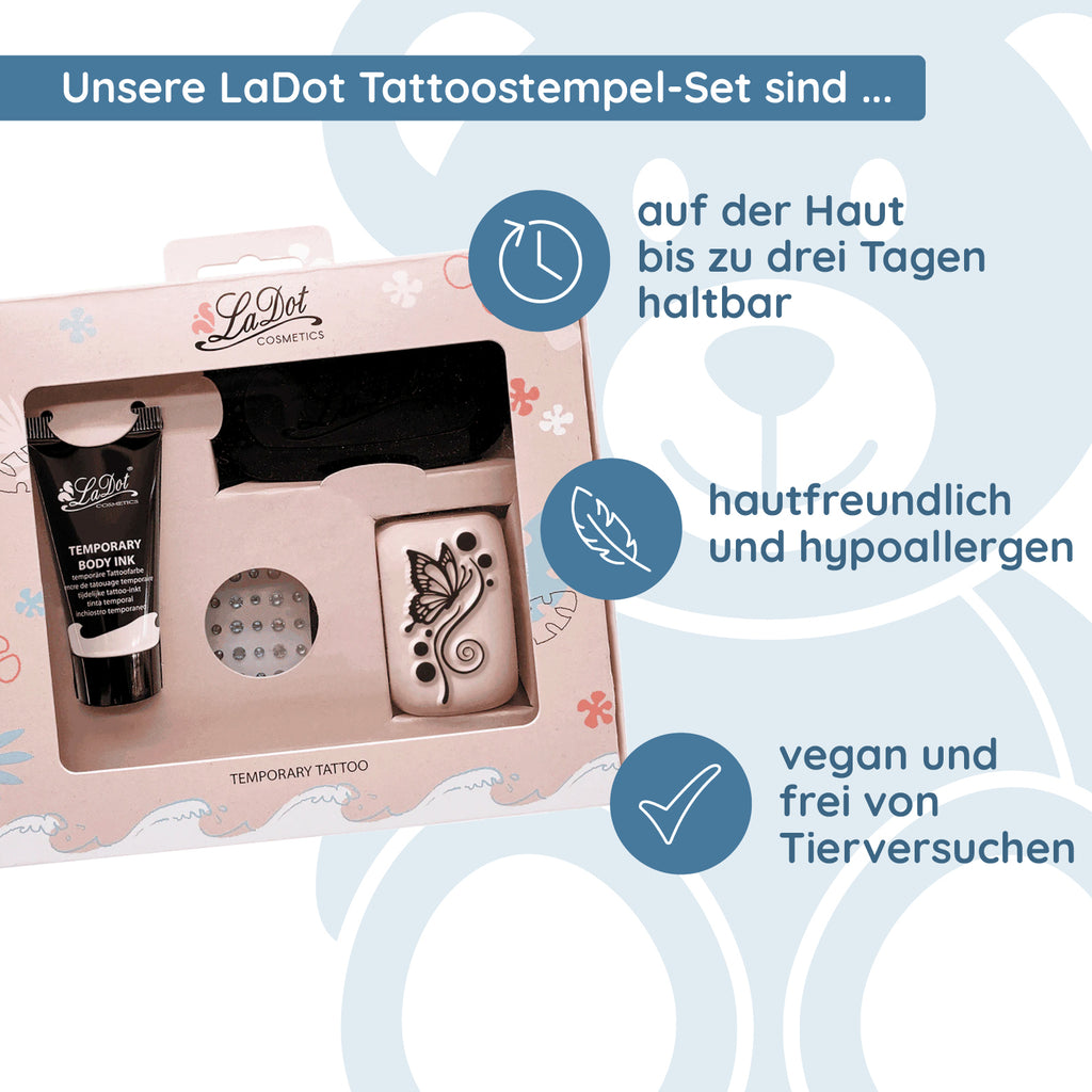 - Style temporaire - Avec LaDot, vous n'avez pas besoin de vous engager à vie. L'encre résistante à l'eau dure jusqu'à trois jours sur la peau selon le type de peau. Les motifs de mini-tatouage discrets ont l'air authentiques et sont absolument tendance.