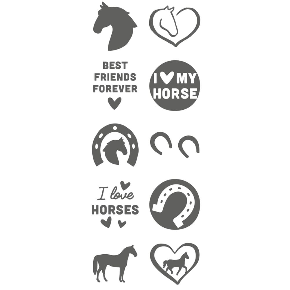 Cet ensemble contient 10 plaques de tampon différentes sur le thème des chevaux, il suffit de les échanger