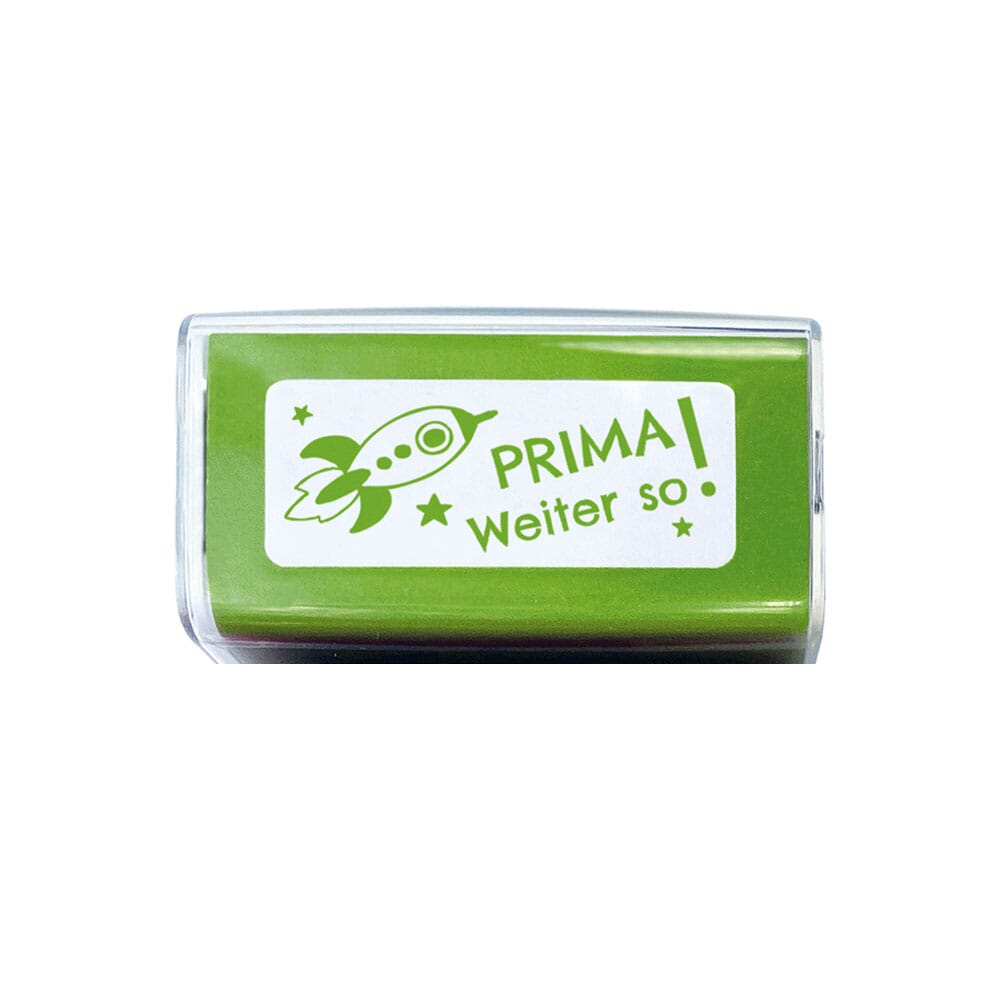 Avec une taille d'empreinte de 38 x 14 mm, le tampon laisse une empreinte claire et bien lisible avec le message « Bravo, continue comme ça! » – parfait pour les cahiers, les tests ou les feuilles de travail.