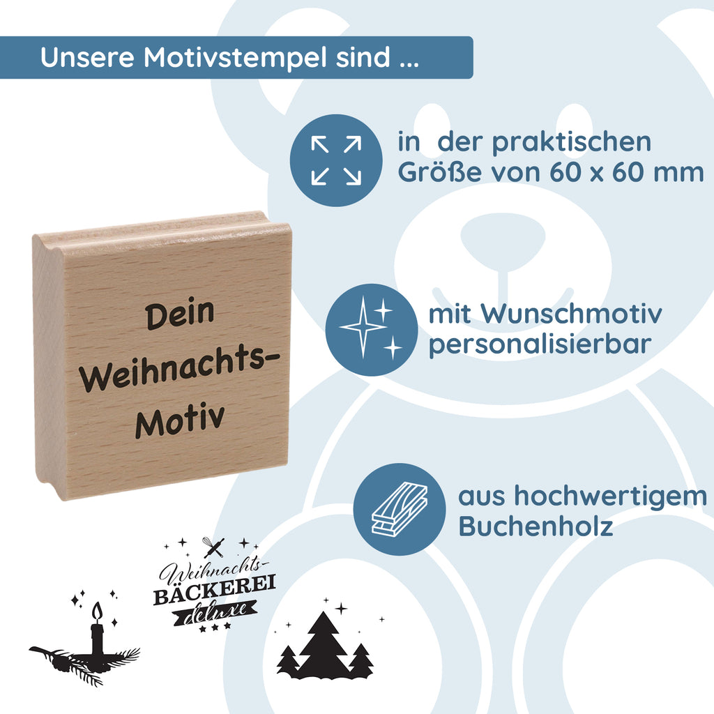 Avec sa taille pratique de 60 x 60 mm, il offre suffisamment de place pour des motifs détaillés comme des flocons de neige, des sapins de Noël, des rennes, des étoiles ou des cadeaux – combinés avec ton texte ou ton nom personnalisé. Ainsi naît un tampon unique qui donne une touche personnelle à tes vœux de Noël.