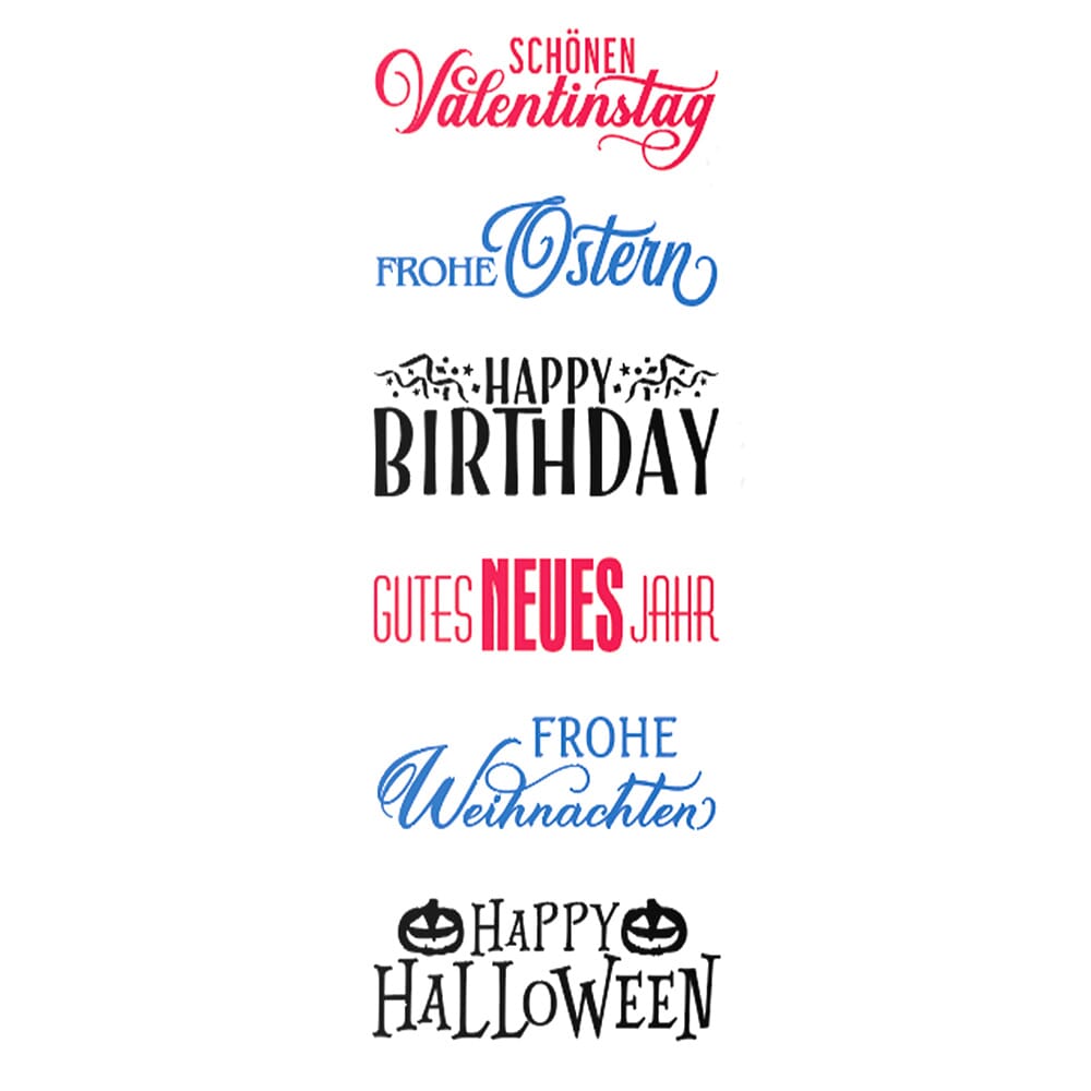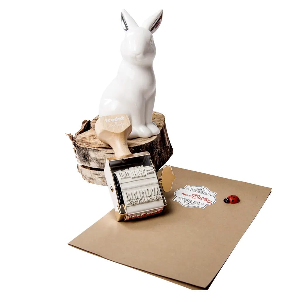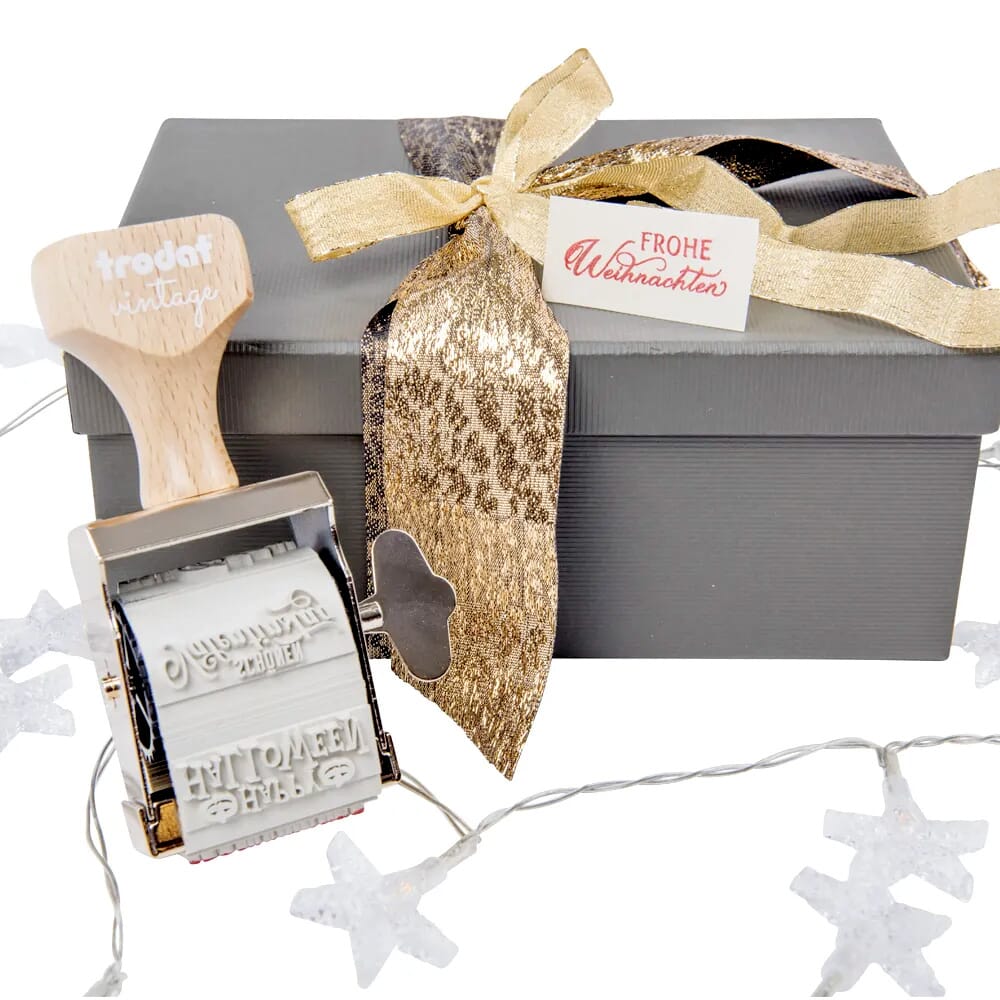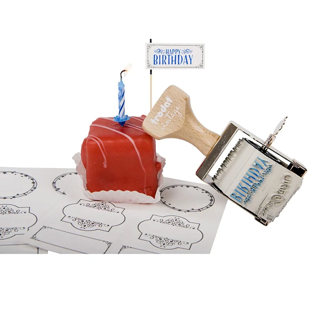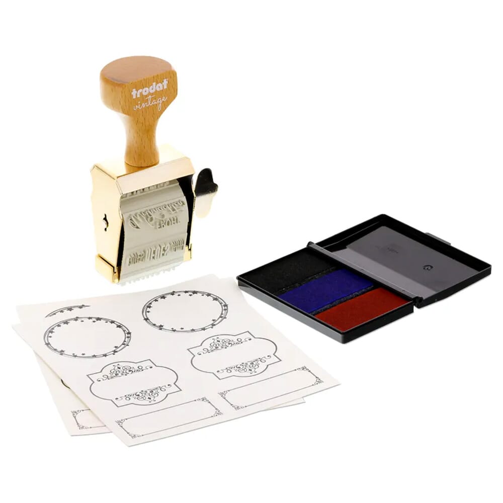 Tampon vintage Trodat avec 6 motifs spéciaux sur le thème des occasions spéciales, incluant 1 tampon encreur manuel avec 3 couleurs (noir, rouge carmin et bleu) et 12 étiquettes adaptées à l'occasion.