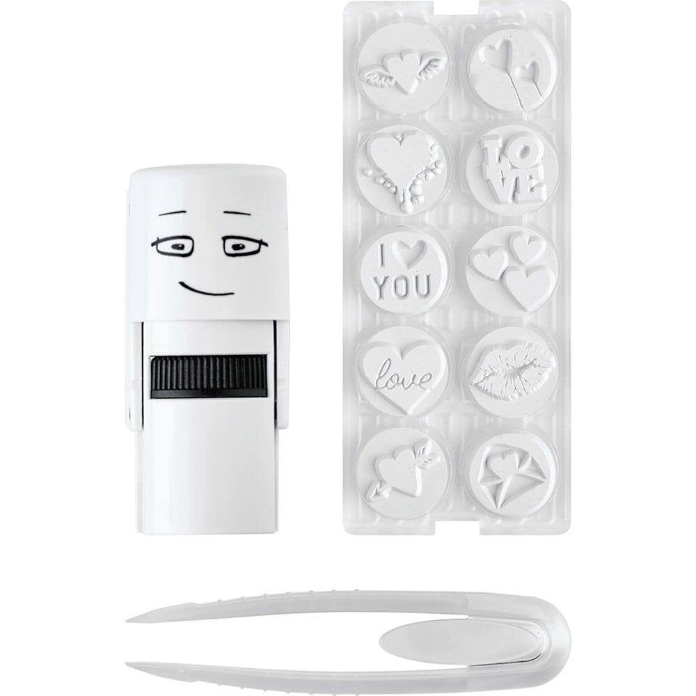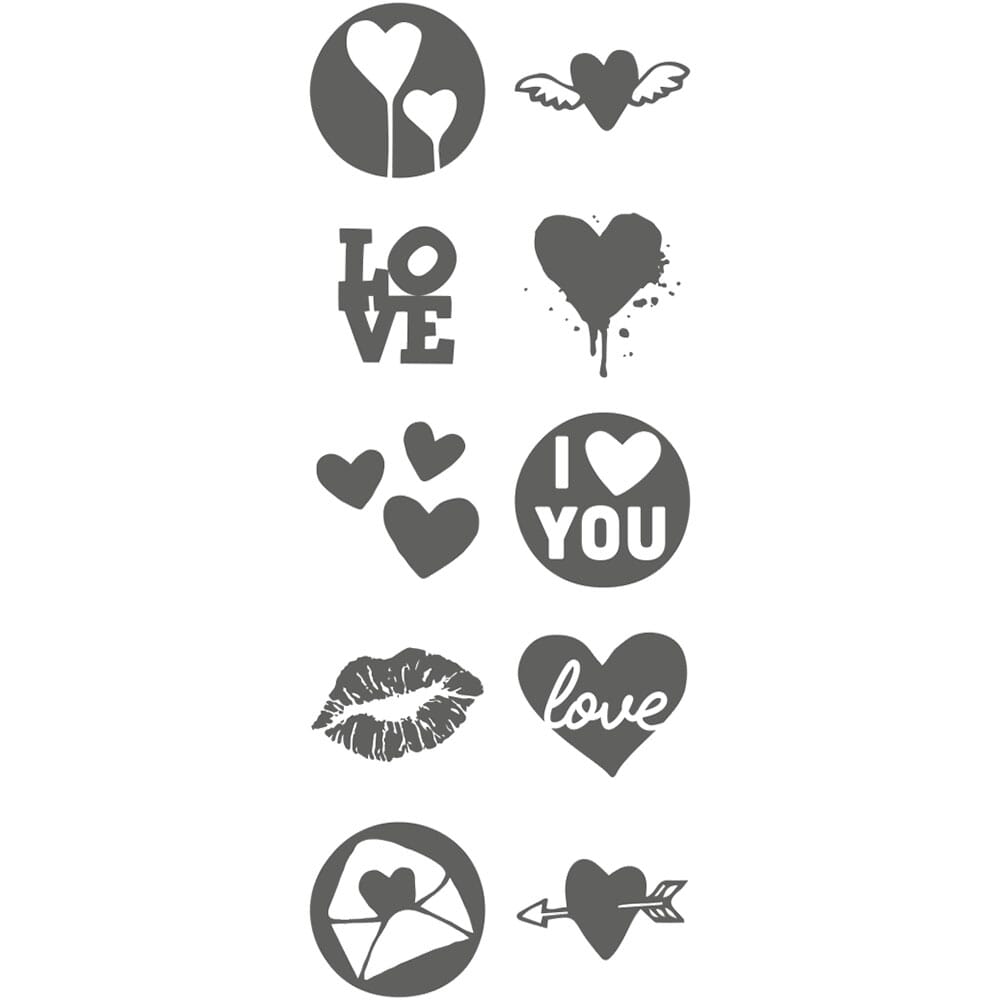 In diesem Set sind 10 verschiedene Stempelplatten enthalten, die zum Thema Love passen, einfach austauschen