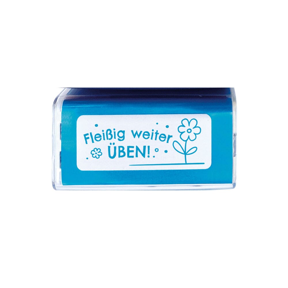 Mit einer Abdruckgröße von 38 x 14 mm hinterlässt der Stempel einen klaren und gut lesbaren Abdruck mit der Botschaft „Fleißig weiter üben“ – perfekt für Hefte, Tests oder Arbeitsblätter.