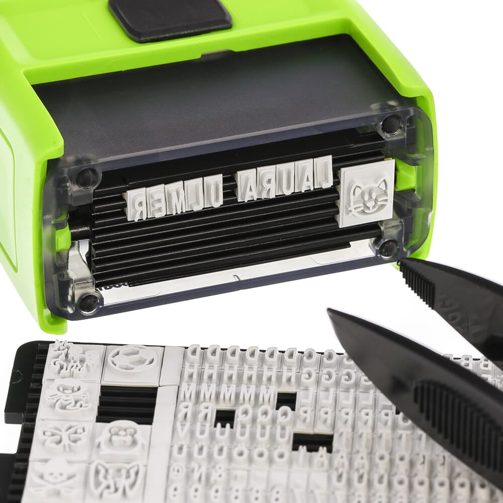 - Einfacher Stempel zum Selbersetzen und rasch wieder zu ändern – Enthält den Stempel mit schwarzem Farbkissen, 1 Buchstaben- und Zahlenset inkl. Motiven für Kinder, 30 wasserfeste Etiketten, 1 Meter Bügelvlies sowie eine Pinzette