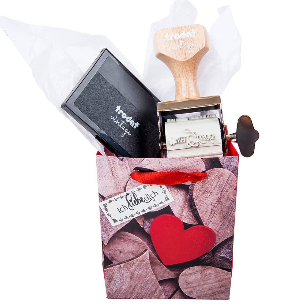 Trodat Vintage Stempel mit 6 besonderen Motiven zum Thema 1 Handstempelkissen mit 3 Farben (schwarz, grün und purpur) und 12 anlassbezogener Etiketten.