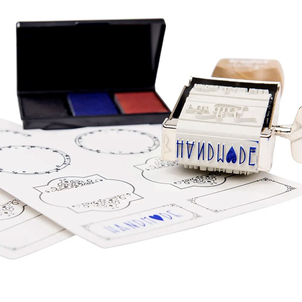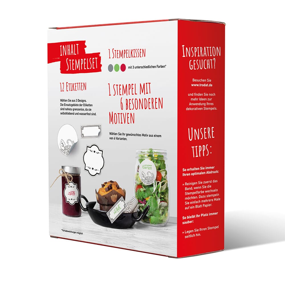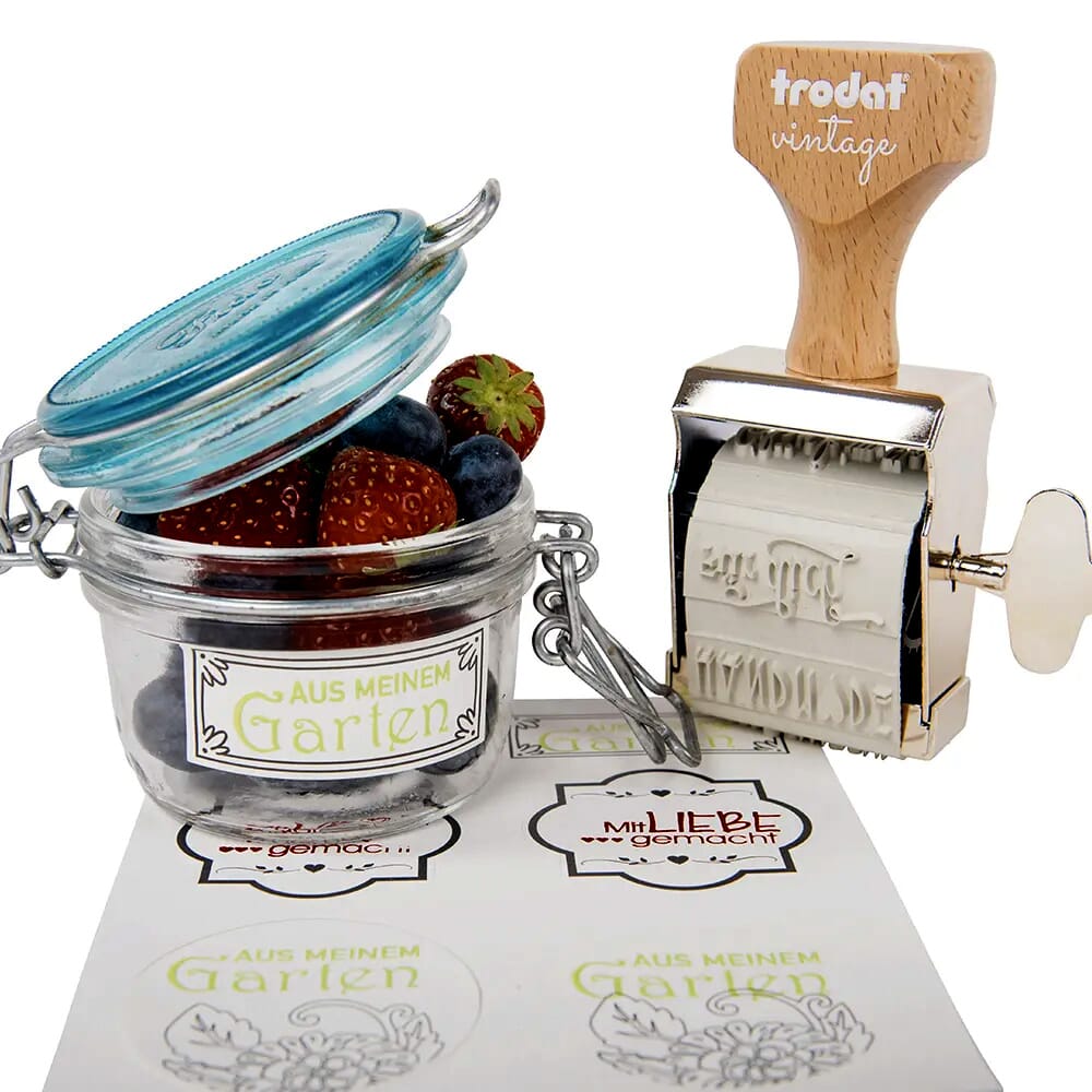 Trodat Vintage Stempel mit 6 besonderen Motiven zum Thema Selbsgemachtes, inklusive 1 Handstempelkissen mit 3 Farben (grau, hellgrün und rot) und 12 anlassbezogener Etiketten.